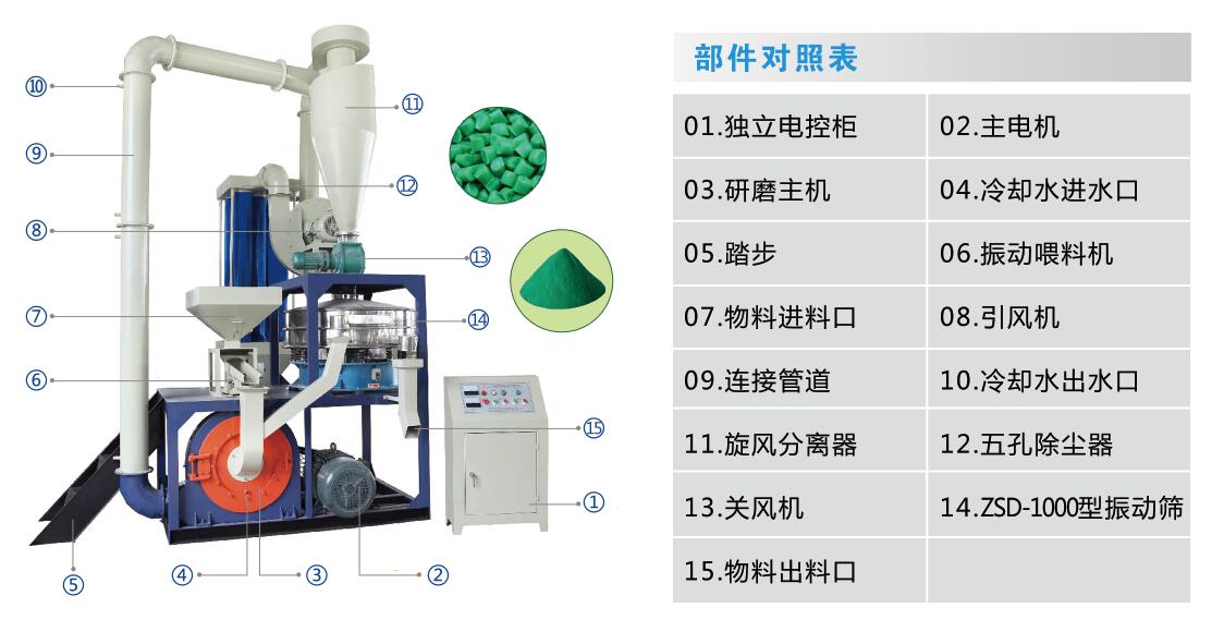 MF系列新型立式磨盘磨粉机磨盘直径最小为350mm,最大为800mm,属于磨盘式磨粉机系列。该磨粉机可用于加工硬度适中,耐冲击及易碎物料,如PE, PVC,PP,ABS,PA,EVA,PET,PS,PPS,EPS,PC,泡沫,牛皮等